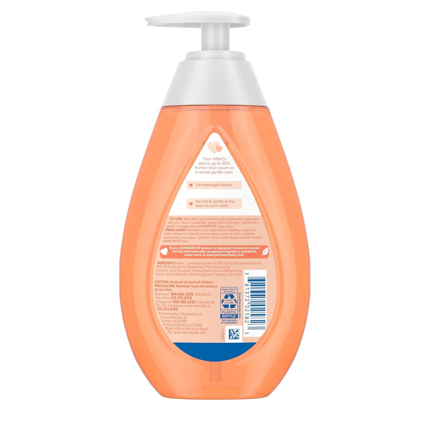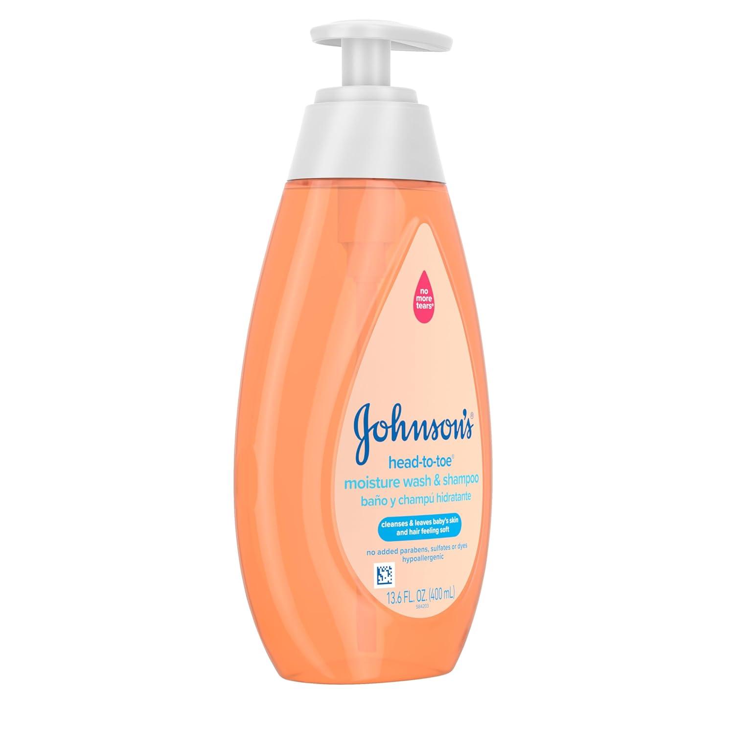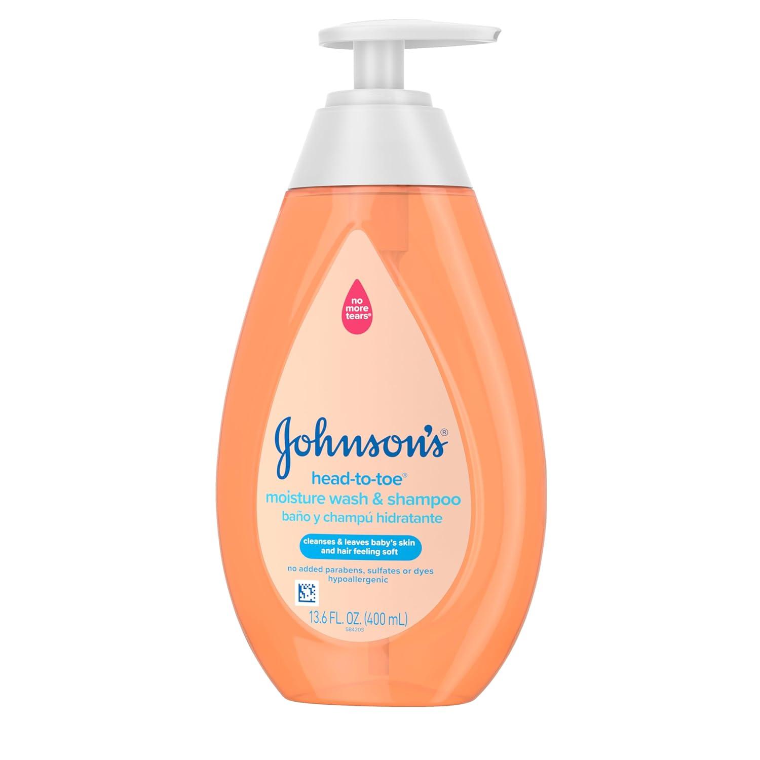 Gently cleanse and care for your baby’s delicate skin and hair with Johnson’s Baby Head-to-Toe Moisture Wash & Shampoo. This 2-in-1 baby wash leaves skin and hair clean and feeling soft and healthy. Apply during bath time with warm water using your hand or a soft washcloth, lather, rinse, and follow with Johnson’s Baby Lotion. The scented, hypoallergenic formula is pH-balanced and has no added parabens, sulfates, and dyes. Johnson’s No More Tears® formula is as gentle to the eyes as pure water and is tested with dermatologists and pediatricians. Clinically proven safe for newborn skin. Johnson’s Baby cares for what’s precious: your baby’s precious skin and hair, and precious moments of bonding. World’s #1 Baby & Child Care Brand* *Source: Euromonitor International Limited; Beauty and Personal Care 2025 ed. As per Baby and Child- Specific Products Category; all retail channels; value sales at RSP; 2024 data.
